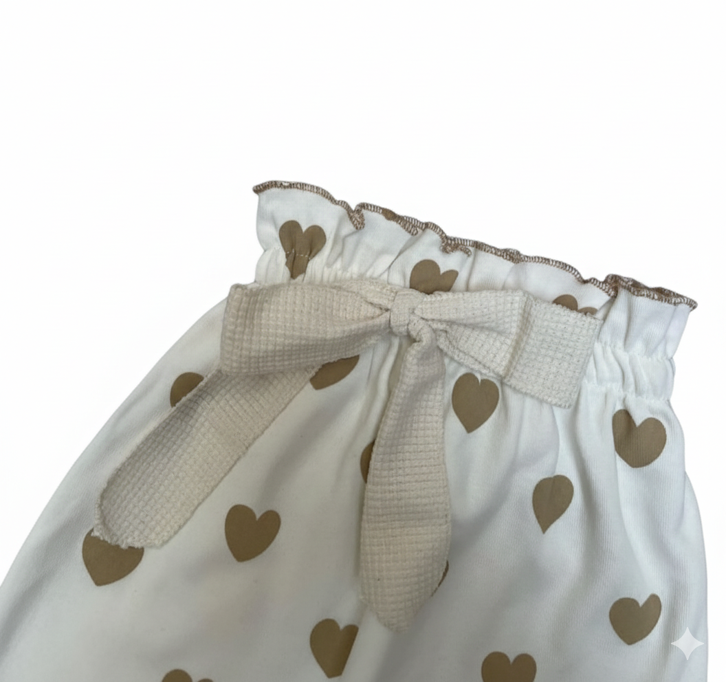 طراحی کاربردی: ترکیب بلوز ساده با شلوار طرحدار قلبی و مچ کشبافت، استایلی شیک و در عین حال راحت برای فعالیت روزمره و مهمانی ایجاد میکند.