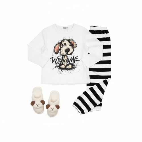 ست بلوز و شلوار راحتی زنانه آستین بلند - طرح سگ و شلوار راهراه - جنس نخ پنبه باکیفیت