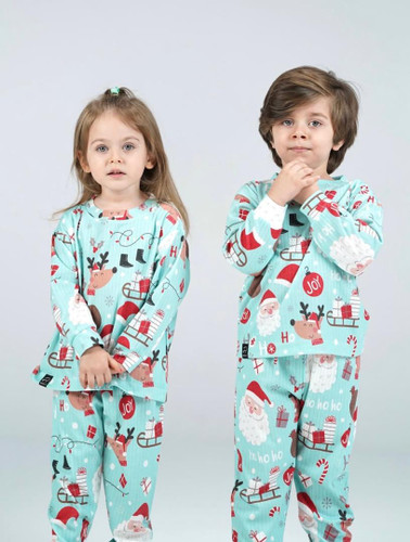 ست بلوز و شلوار دورس پنبهای بچگانه طرح کریسمس با رنگ فیروزهای و چاپ ضدحساسیت