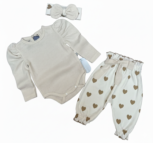 ست ۳تیکه دخترانه وارداتی (برند ترک)، جنس پنبه کبریتی با شلوار طرح قلبی و هدبند پاپیونی