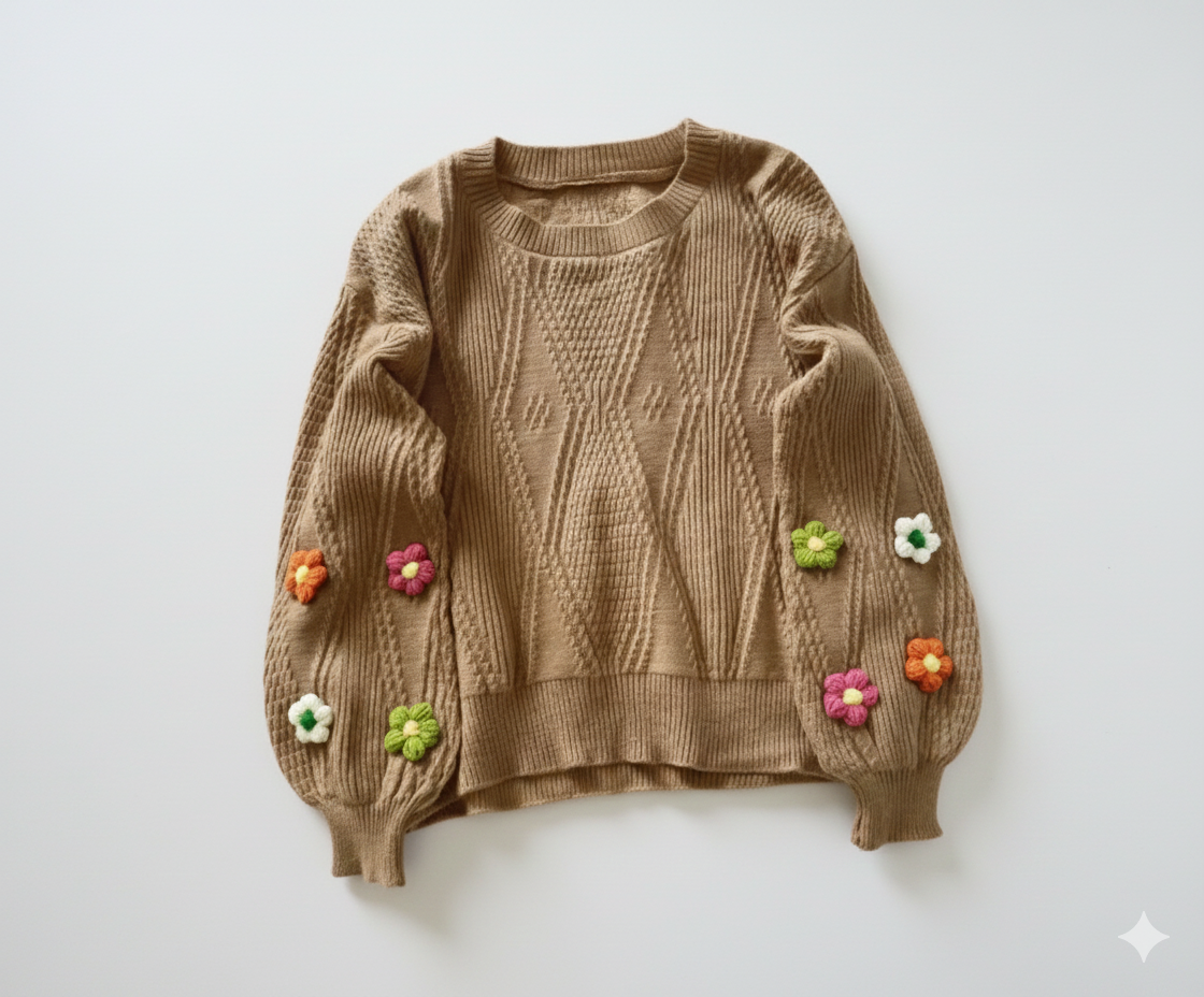 ناموجودبلوز بافت زنانه رنگ قهوهای با مدل آستین پفی بلند و تزیین گلهای برجسته رنگی